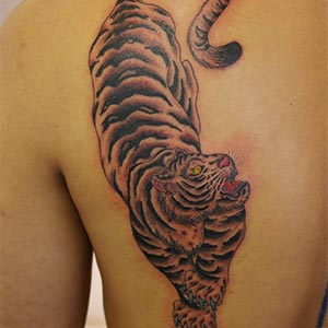 虎は伝統的な刺青の図柄からポップな洋柄まで様々なスタイルで用いられるデザインで、古くから龍と並び人気のモチーフです。水滸伝の中でも虎を退治する事が、武勇を表現する一つにもなっています。