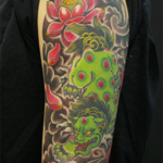 龍と、背景に額を付けたTATTOO(刺青)画像です。口を開けた顔は目立つ様に男性の胸にデザインし、肩を通って腕につなげています。大阪府 大阪市 中央区 西心斎橋 2丁目18-6 アベニュー心斎橋 407号室