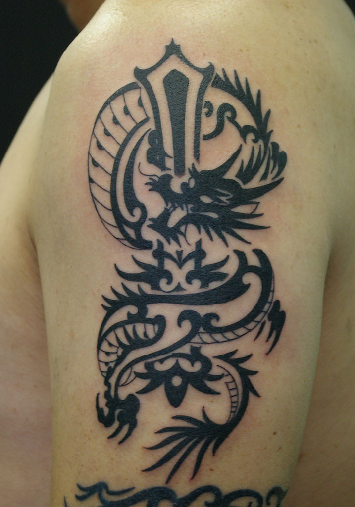 龍と剣をトライバルスタイルでデザインしたTATTOO(刺青)画像です。不動明王が持つとされる「倶利伽羅剣」をイメージして男性の腕へ彫っています。大阪府 大阪市 中央区 西心斎橋 2丁目18-6 アベニュー心斎橋 407号室