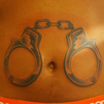 手錠と目とハートを組み合わせたTATTOO(刺青)画像です。まっすぐ見つめる目とまつ毛の様なデザインをハートで囲み、下に小さな手錠を合わせて女性の手首へ彫りました。大阪府 大阪市 中央区 西心斎橋 2丁目18-6 アベニュー心斎橋 407号室