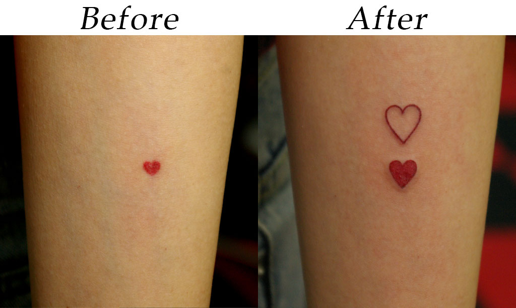 元あった小さなハートを、二つのハートでカバーしました。にじんでしまっていたハートを少し大きなハート型ですっぽり覆い、その上にラインだけのハートを彫りました。大阪府 大阪市 中央区 西心斎橋 2丁目18-6 アベニュー心斎橋 407号室
