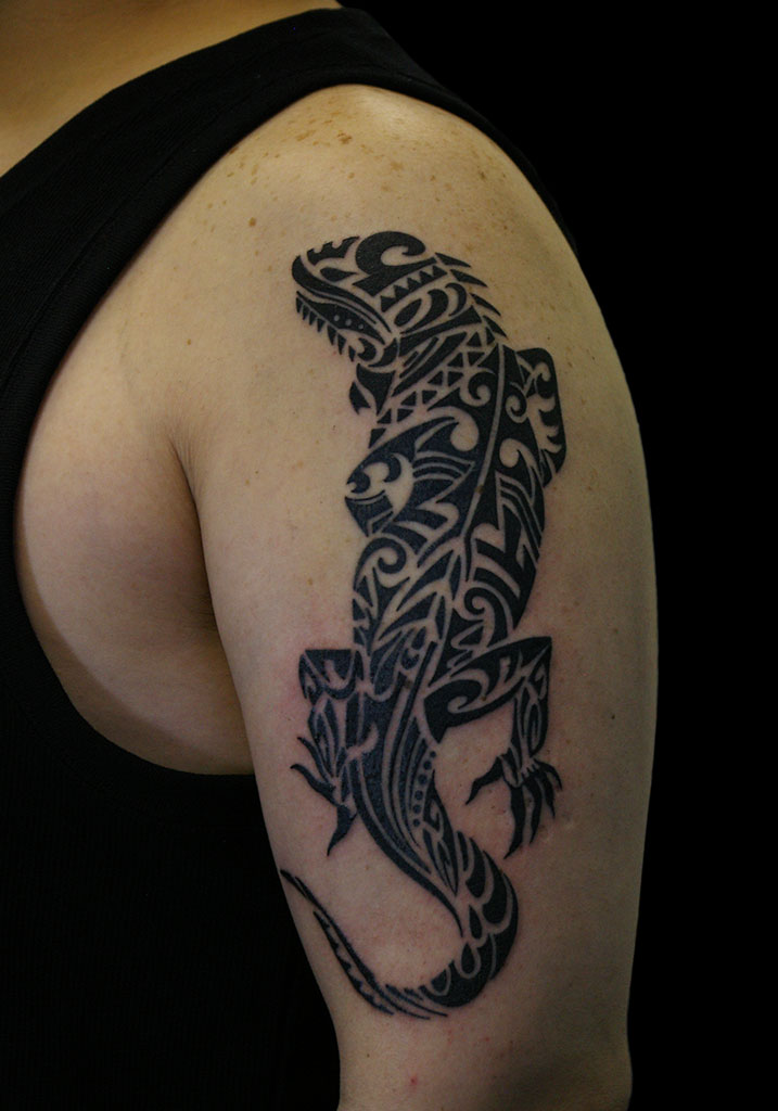 イグアナのトライバルデザインを男性の左上腕に彫りました。イグアナは多様な環境における爬虫類の擬態能力と回復力から知性や冷静さ、忍耐力などを意味すると言われています。大阪府 大阪市 中央区 西心斎橋 2丁目18-6 アベニュー心斎橋 407号室