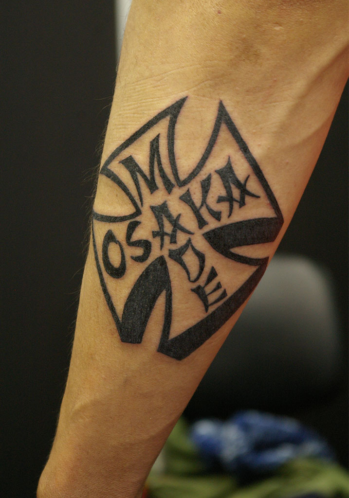 アイアンクロスに「OSAKA MADE」の文字を組み入れたTATTOO(刺青)画像です。鉄十字の中に、OSAKAとMADEのAの文字が重なるようにデザインして、男性の左腕へ彫りました。大阪産(大阪生まれ)と言った意味になるでしょうか。大阪府 大阪市 中央区 西心斎橋 2丁目18-6 アベニュー心斎橋 407号室