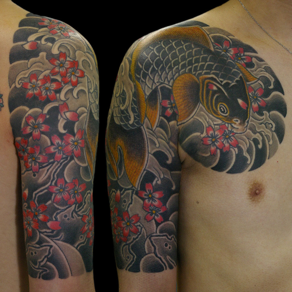男性の胸から上腕にかけて鯉と桜と額を彫りました。