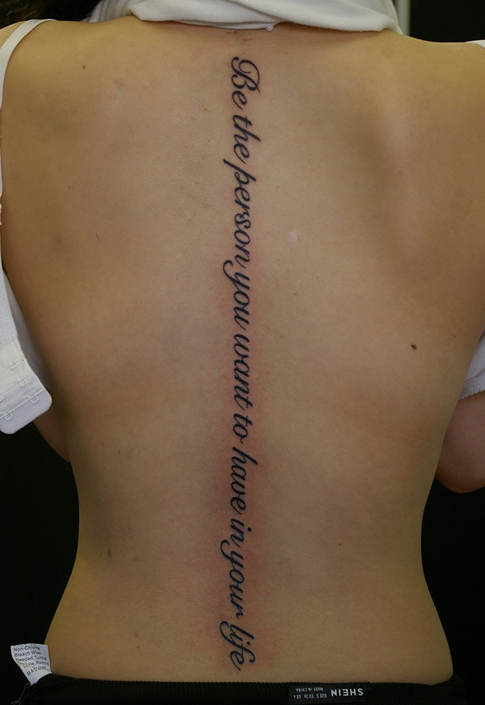 筆記体で「Be the person you want to have in your life」の英語の言葉を女性の背中の背筋に沿って彫りました。日本語にすると「あなたが人生でなりたい人物像になりなさい」と言った意味になります。大阪府 大阪市 中央区 西心斎橋 2丁目18-6 アベニュー心斎橋 407号室