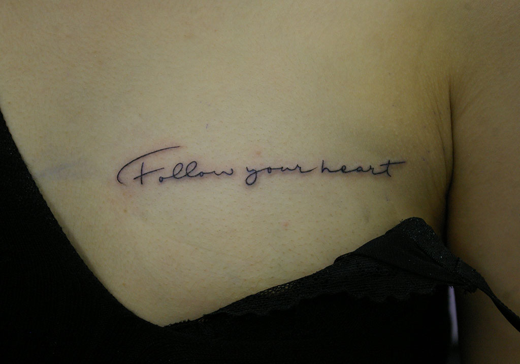「Follow your heart」の文章を細い線の文字で彫りました。日本語に訳すと「あなたの心で思う通りにしなさい」と言った意味になります。自分を信じて思った道を進め。スティーブ・ジョブズも卒業スピーチで多用した言葉だそうです。大阪府 大阪市 中央区 西心斎橋 2丁目18-6 アベニュー心斎橋 407号室