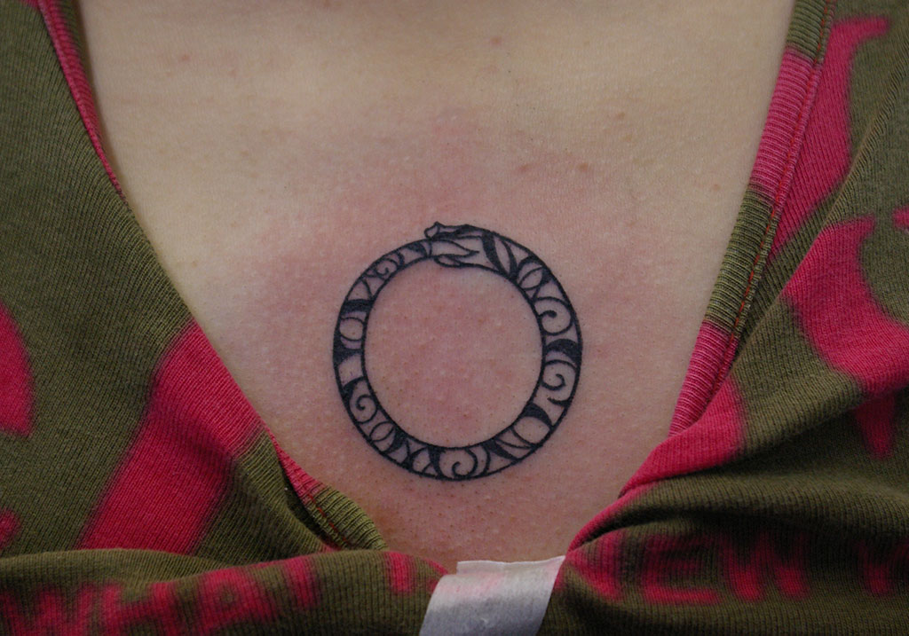 小さなウロボロスの古代の象徴のTATTOO(刺青)画像です。蛇が自身の尾をくわえて円になったウロボロスと呼ばれるモチーフを、体の模様を特徴に女性の胸元へデザインしています。大阪府 大阪市 中央区 西心斎橋 2丁目18-6 アベニュー心斎橋 407号室