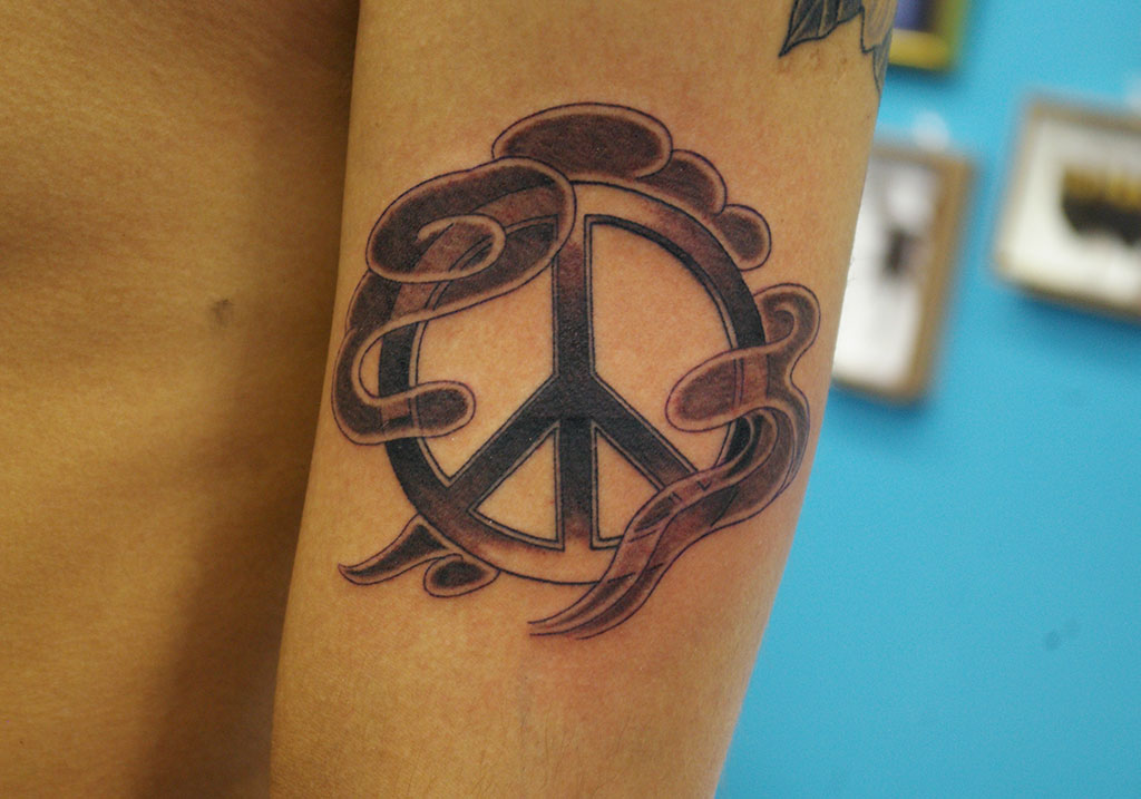 男性の左上腕にピースマークと雲のタトゥーを彫りました。
