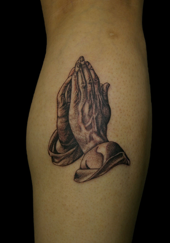 男性のふくらはぎにプレイングハンズを彫りました。日本語だと「祈り手」とも呼ばれるデザインで、祈りを捧げる手をモチーフにしています。大阪府 大阪市 中央区 西心斎橋 2丁目18-6 アベニュー心斎橋 407号室