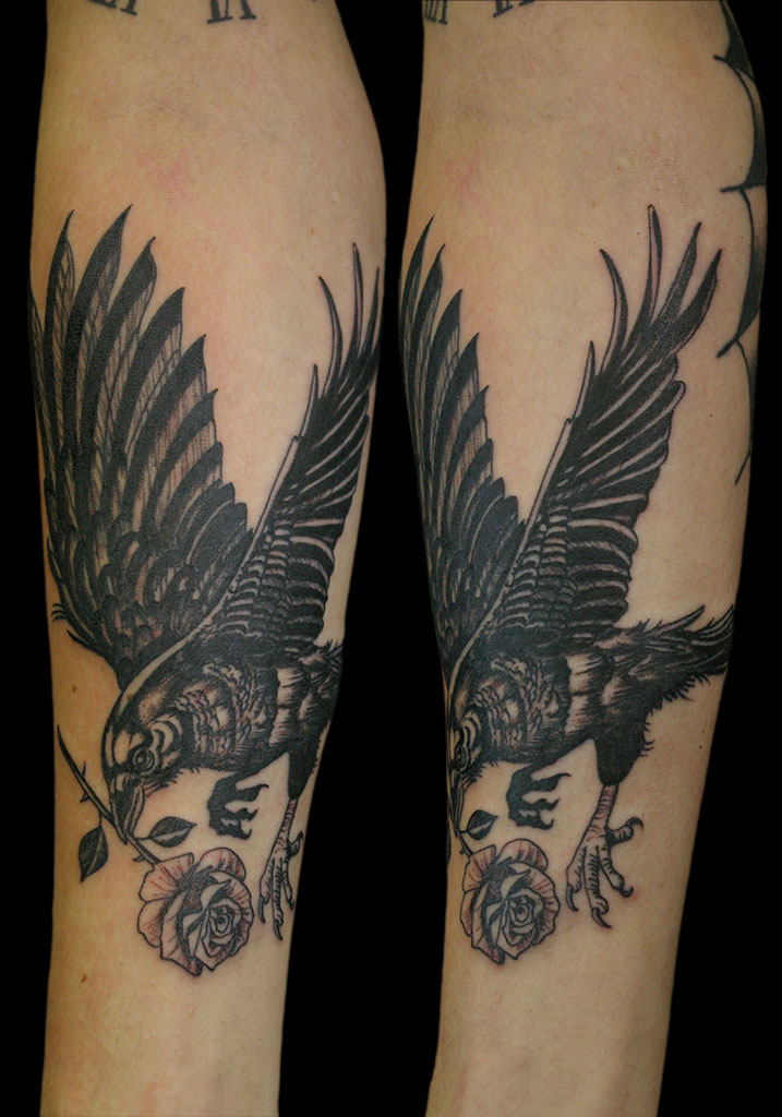 烏と薔薇のデザインをブラックアンドグレースタイルで男性の前腕に彫りました。カラスが一本のバラを口にくわえているデザインです。大阪府 大阪市 中央区 西心斎橋 2丁目18-6 アベニュー心斎橋 407号室