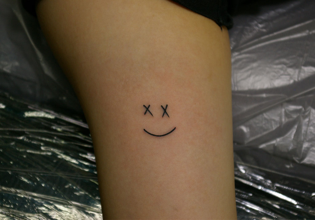 女性の二の腕にバツ目のスマイリーフェイスのデザインを彫らせていただきました。スマイリーフェイスの目が「x」になっています。元ワンダイレクションのルイ・トムリンソンもこのデザインのタトゥーを入れています。大阪府 大阪市 中央区 西心斎橋 2丁目18-6 アベニュー心斎橋 407号室