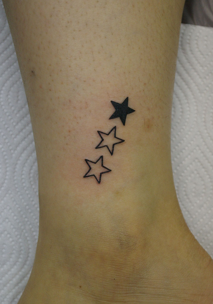 三連の星が綺麗に並ぶTATTOO(刺青)画像です。女性の足首へ、一番上の黒色で塗りつぶした星にラインだけの二つの星を続けて彫りました。大阪府 大阪市 中央区 西心斎橋 2丁目18-6 アベニュー心斎橋 407号室